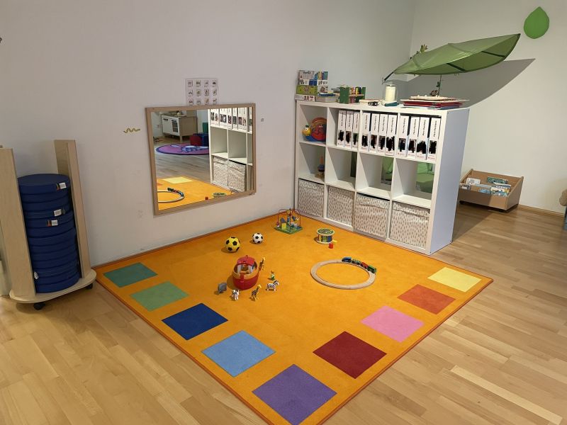 Für die Krippenkinder steht ein großer, kindgerechter Gruppenraum mit Kinder-Tischen, ein Schlafraum, ein Wickel-/Sanitäterbereich und eine Garderobe zur Verfügung. Da in den Räumlichkeiten nur max. 12 Kinder betreut werden, herrscht eine sehr familiäre Atmosphäre. Auch eine Küche ist vorhanden.